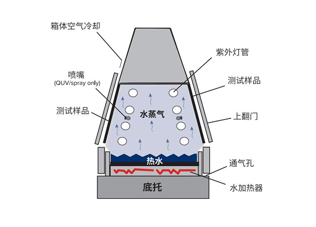 QUV/spray与标准的QUV/se有着相同的功能,此外还包括一个水喷淋系统。